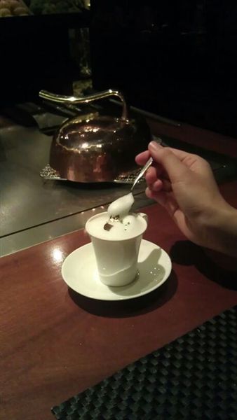 上半部是奶泡,要跟下層菇菇湯攪拌後再喝