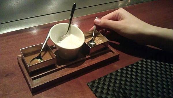 端上牛排佐料,茴香醬/宏德鹽之花/芥茉籽醬