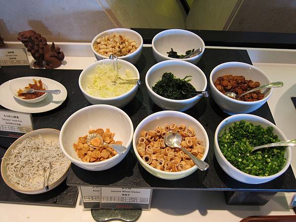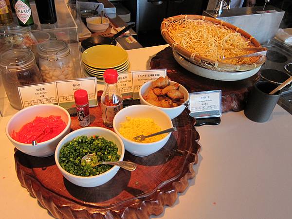 餐檯上有一區是調味料 Tabasco 大蒜 辣油 五味粉等任君自行發揮