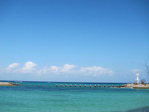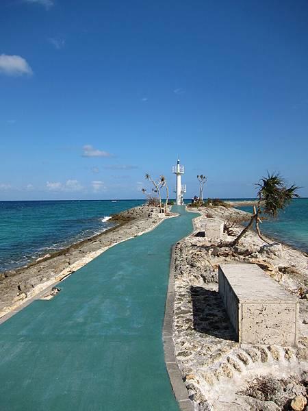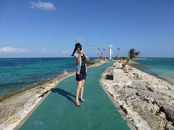 挺著肚子往海中步道的燈塔走去 曬曬太陽散步消化